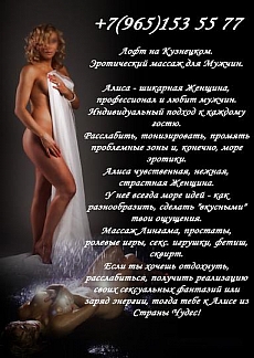 Шикарная Женщина, професпрофессионал и любит мужчин. Богатый опыт позволяет индивидуальный подход к каждому гостю. Расслабить, тонизировать, промять проблемные зоны и, конечно, море эротики. Яркие страсти кипят в спальне у Алисы - она чувственная, нежная, страстная женщина. У Алисы всегда море идей - как разнообразить, сделать "вкусными" твои ощущения. Каждый массаж индивидуален, он всегда, как новая программа. Авторский массаж Шелковый рай от Алисы - это альтернатива масляному массажу. Он очень оригинален по материалам и дивайзам - горячие фрукты, техника "Лёд и Пламень",массаж Лингама (ему она обучалась у китайских мастериц), имитация оральных ласк - ласки губами и язычком всей твоей паховой зоны..., больше оргазмов и дольше по времени. Алиса любит фут-фетиш и ролевые игры - делись с ней своими секс.фантазиями и она реализует из для тебя! ;) Это дар - быть любящей, увлеченной, креативной, внимательной с мужчинами и женщинами. Итак, если ты хочешь качественный массаж, чувственных прикосновений и ярких эмоций, тогда тебе к Алисе из Страны Чудес! И, мужчины! Алиса умоляет вас - не мучайте её допросами с пристрастием - она точно не салон! Она работает индивидуально. У неё не кабинет, и не квартира. У неё пентхаус в центре Москвы. Возможен выезд -2 часа -12000₽. Звоните и наслаждайтесь))).